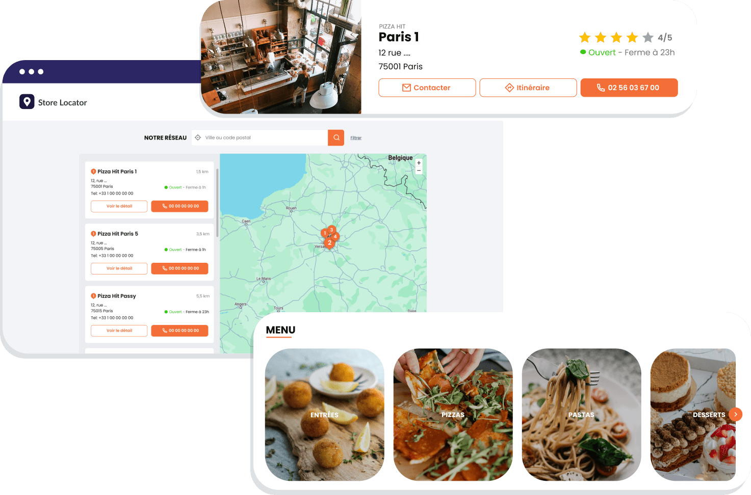 Choisissez parmi nos modèles de Store Locator optimisés avec les informations clés pour le SEO Local (avis clients, horaires, services…) et synchronisés avec Digitaleo.